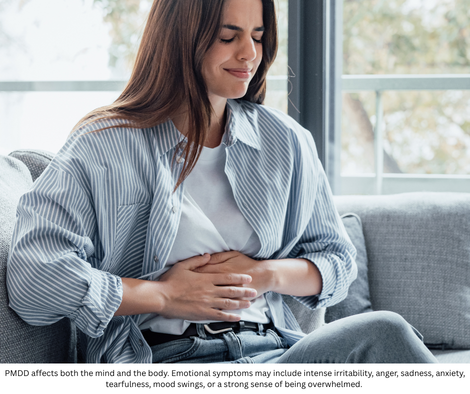 PMDD affects both the mind and the body. Emotional symptoms may include intense irritability, anger, sadness, anxiety, tearfulness, mood swings, or a strong sense of being overwhelmed. Some people also notice difficulty concentrating, low motivation, hopelessness, or feeling disconnected from others. Physical symptoms can include bloating, breast tenderness, headaches, fatigue, changes in appetite, and sleep problems.